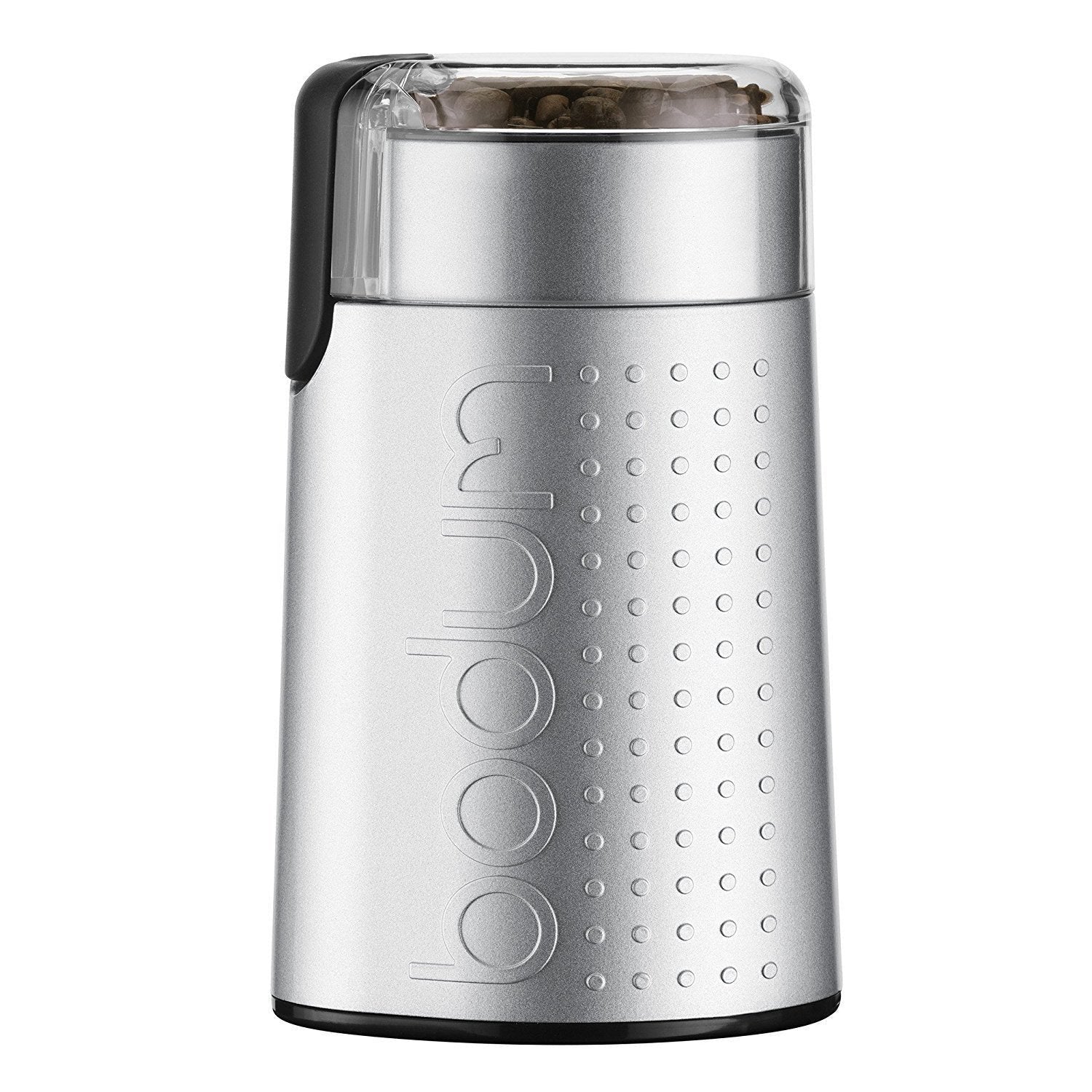 The Bistro Electric Blade Coffee Grinder in Aluminum by Bodum takes coffee beans from coarse to fine quickly and efficiently for fresh coffee brewing. This coffee grinder by Bodum has a 100% aluminum body and durable stainless steel cutting blade spins at a precise RPM with an easy push-button for pulse action grind or continuous grinding.