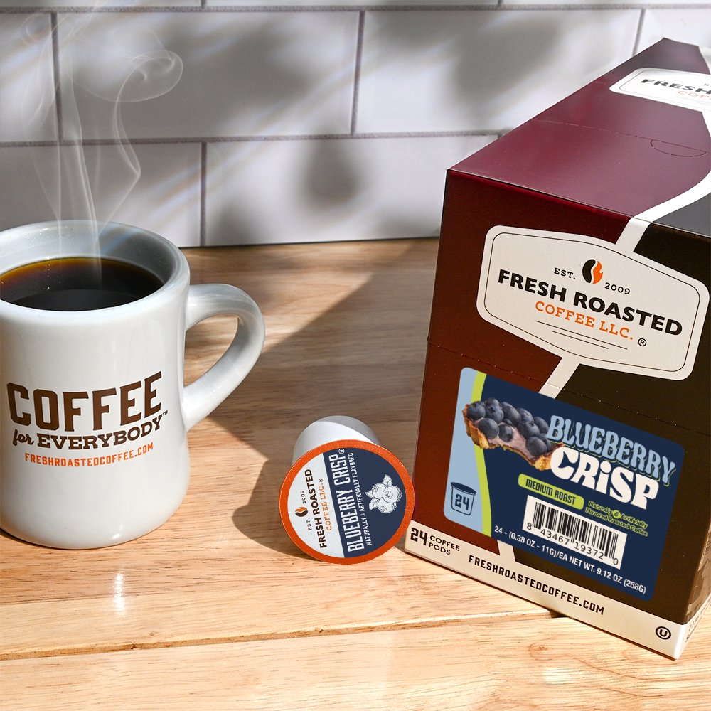 Craving a delicious dessert but not the calories? Our new Blueberry Crisp Flavored Coffee Pods give you all the fruity, warm, cinnamon goodness along with your favorite Fresh Roasted Coffee in a convenient, delectable, guilt free cup.