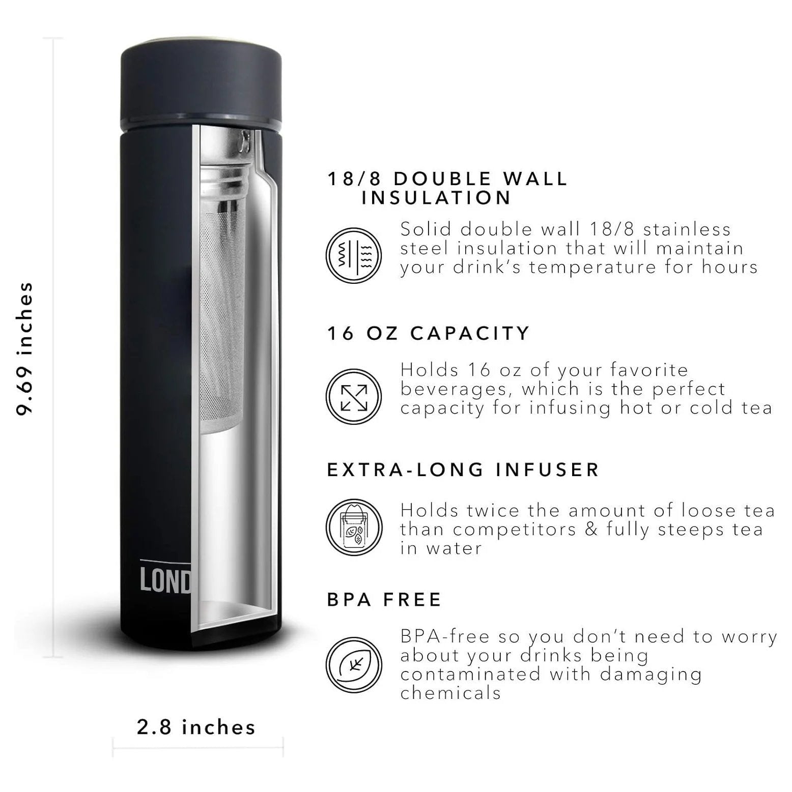 Enjoy tea and fruit infused water anywhere! Simply add loose leaf tea, coffee, or fruit to the uniquely designed two piece infuser system, add water, and head out the door. The longer 4” length of the infuser holds more tea or coffee allowing it to fully steep and when adding fruit to your bottle the upper portion of the system acts a strainer to keep the fruit in the bottle where it belongs. Constructed of durable and corrosion resistant stainless steel, the dual-walled construction will keep your cold drinks cold and your hot drinks hot for hours on end.